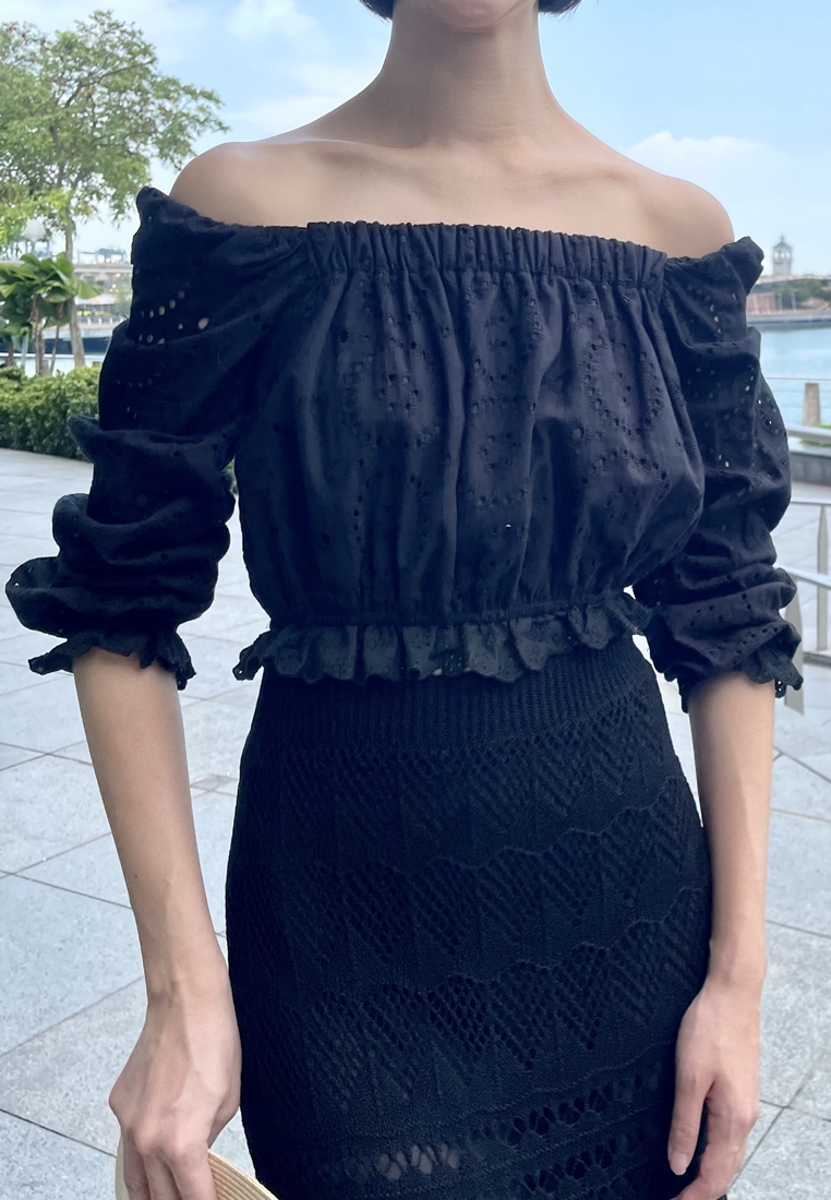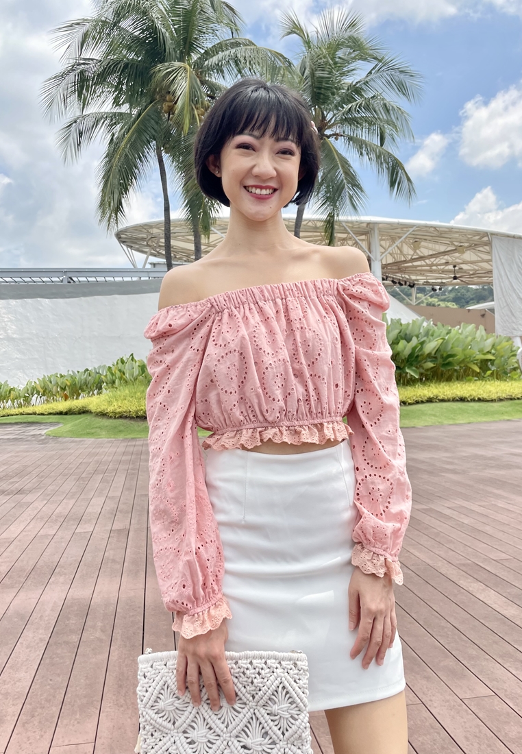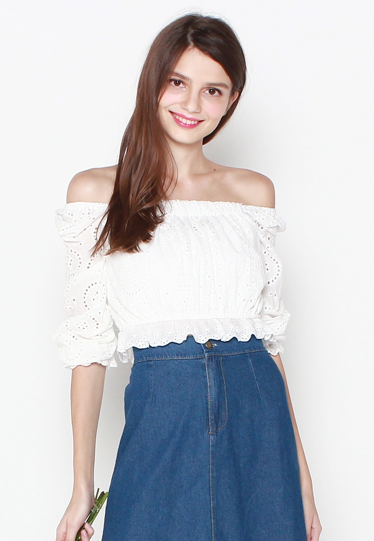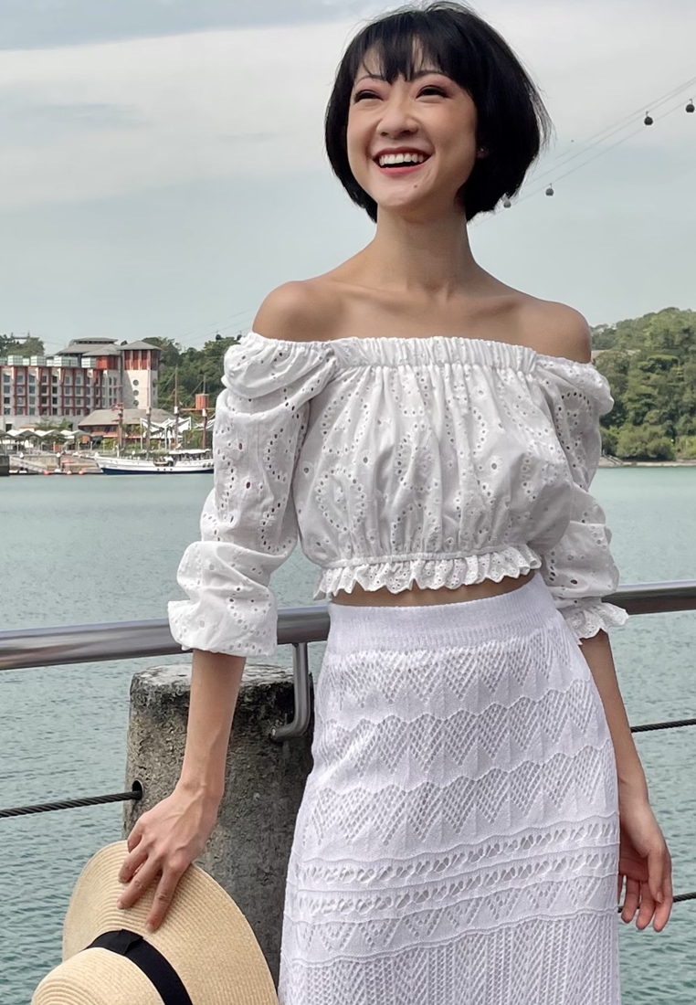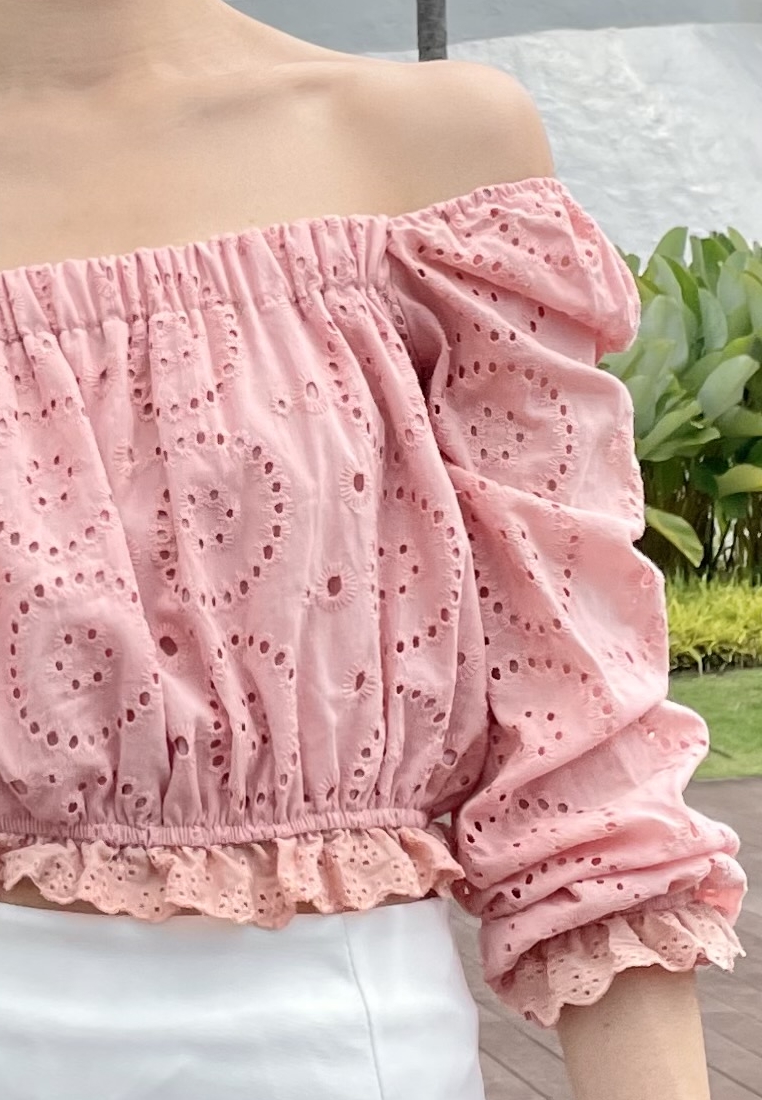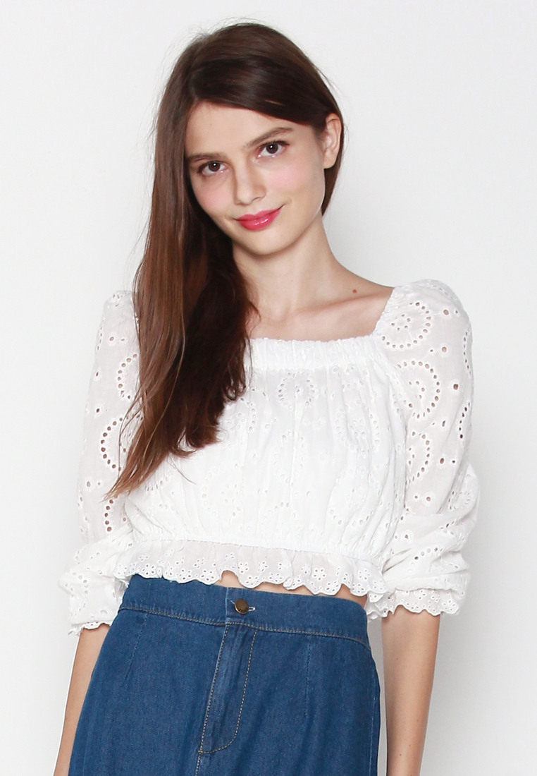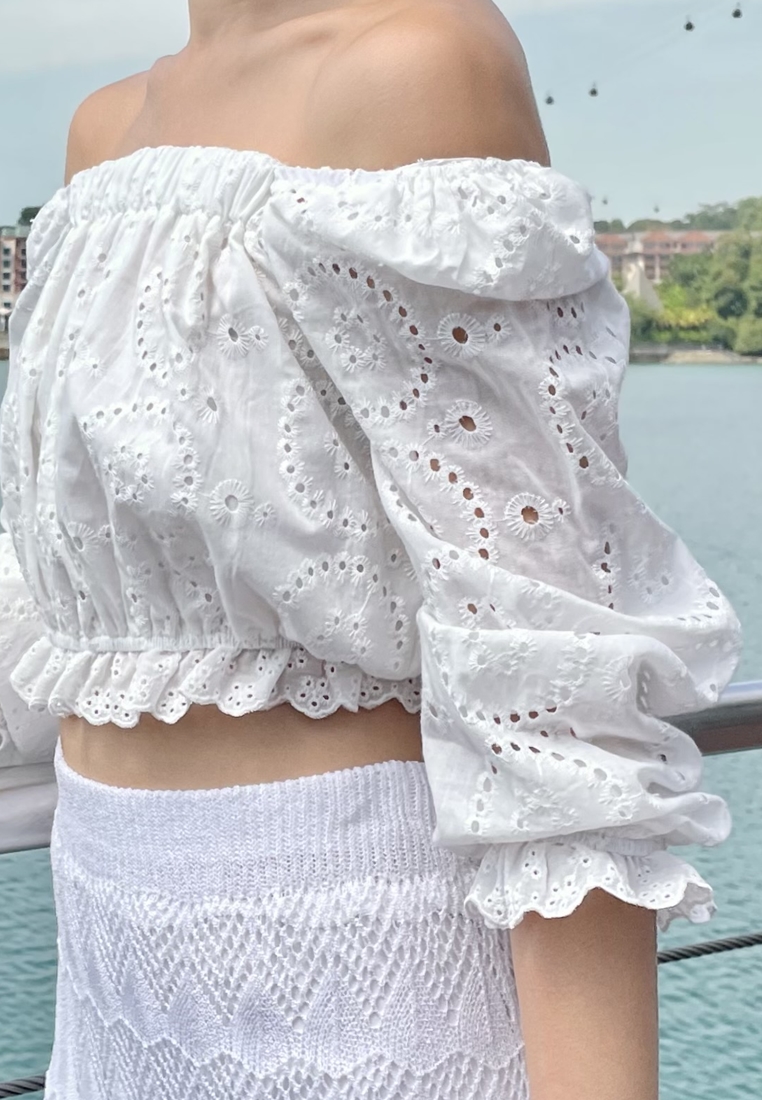 Cotton eyelet embroidery cropped top featuring long puffed sleeves, two-way elasticize off-shoulder/square neckline, and smocked waist with scalloped hem detail