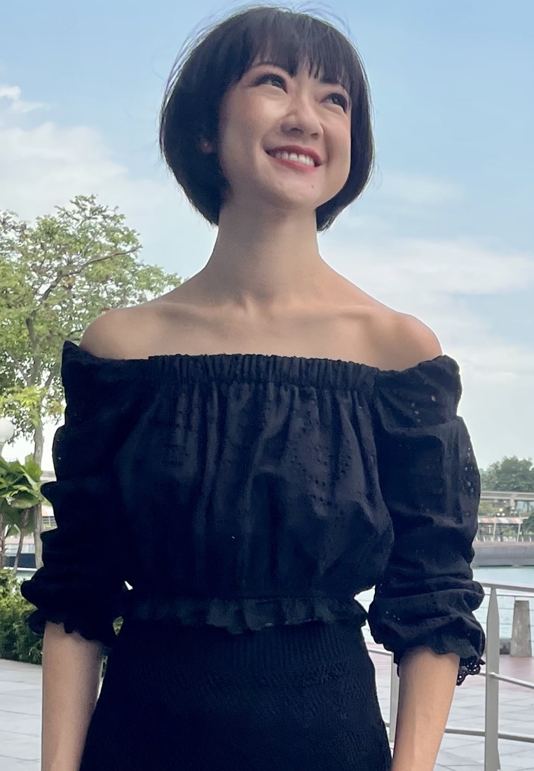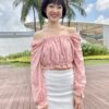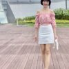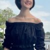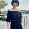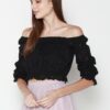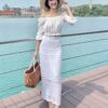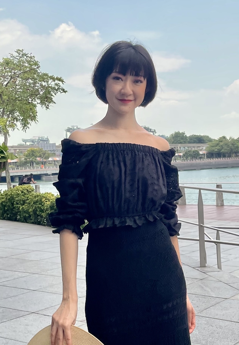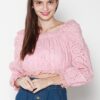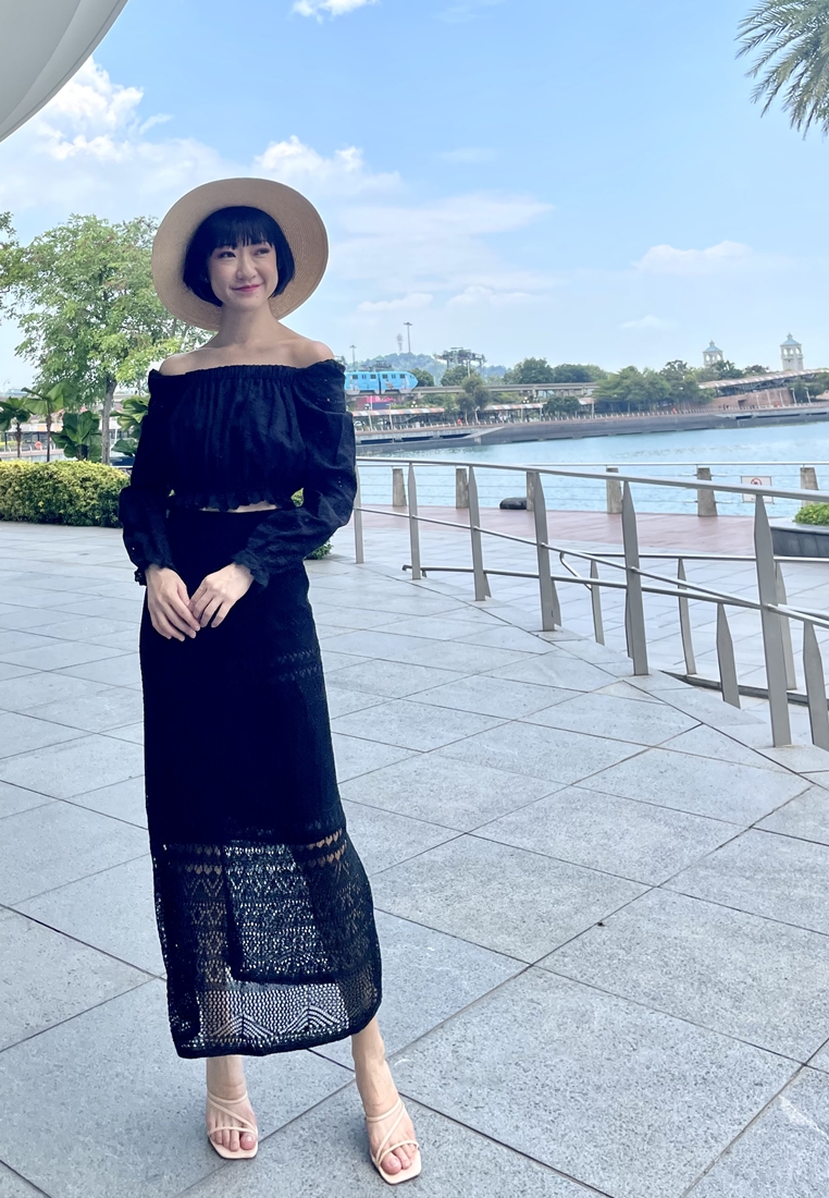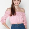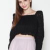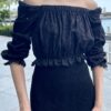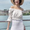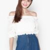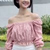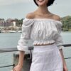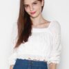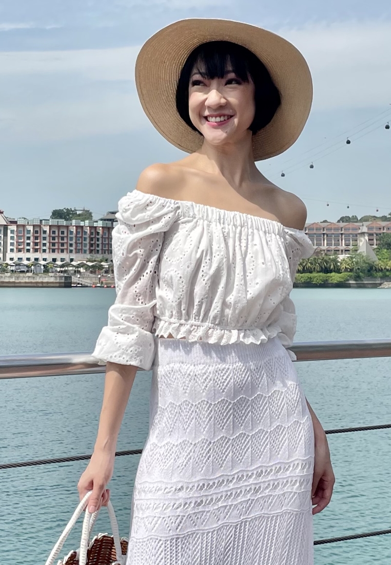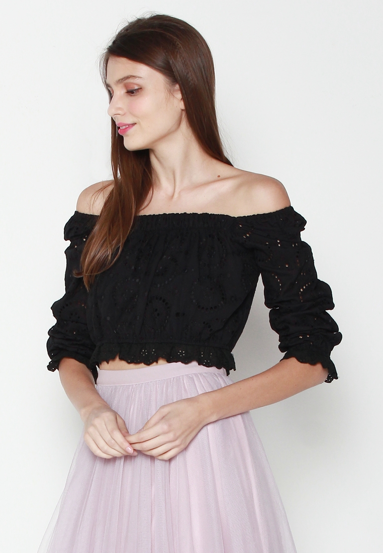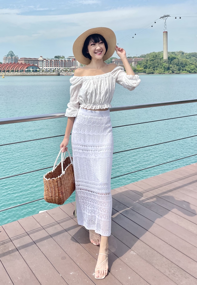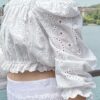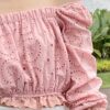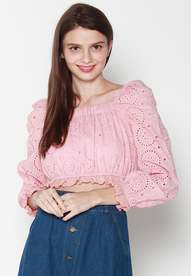 Cotton eyelet embroidery cropped top featuring long puffed sleeves, two-way elasticize off-shoulder/square neckline, and smocked waist with scalloped hem detail