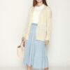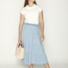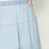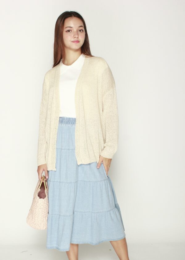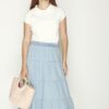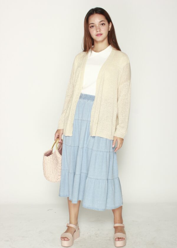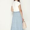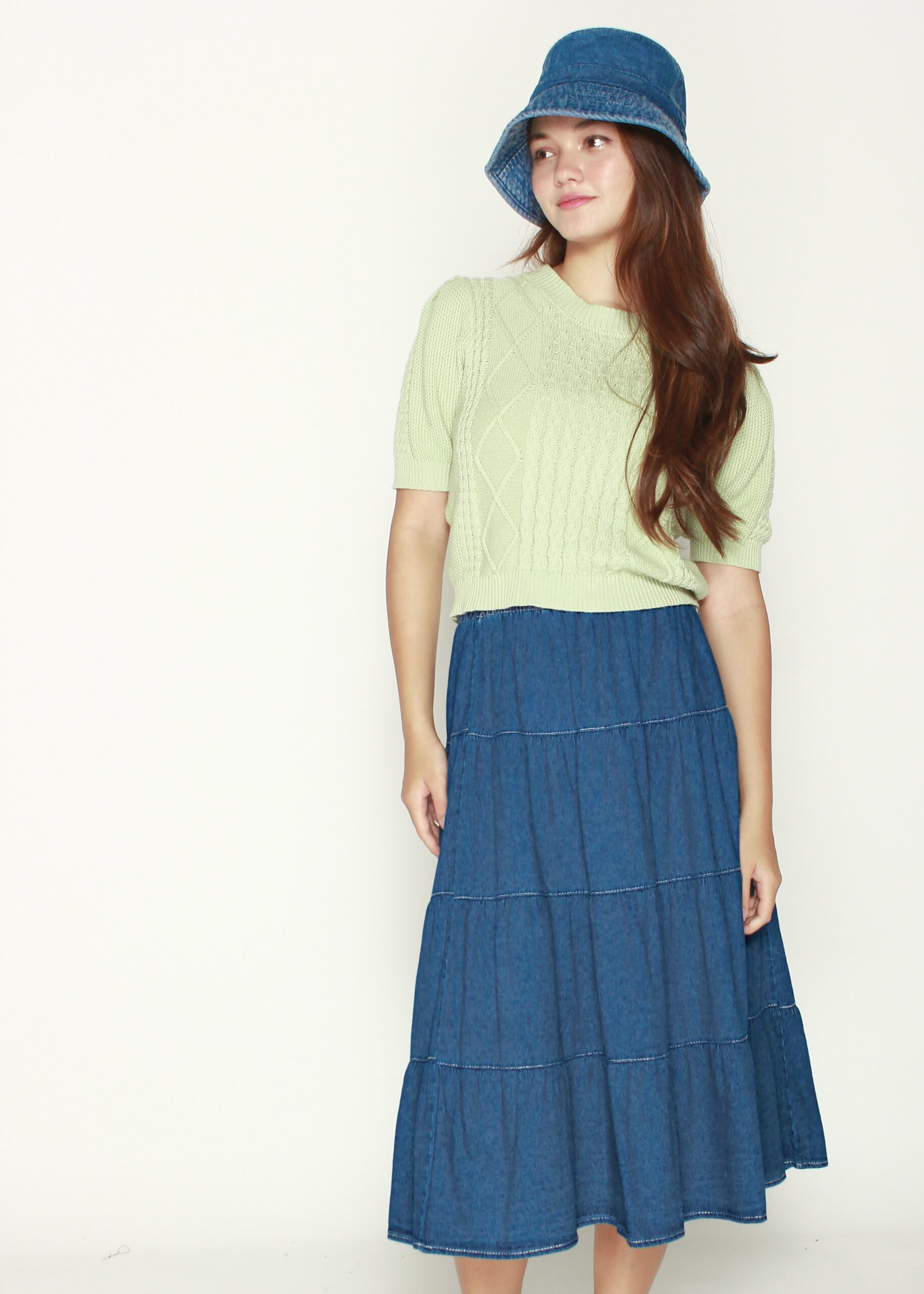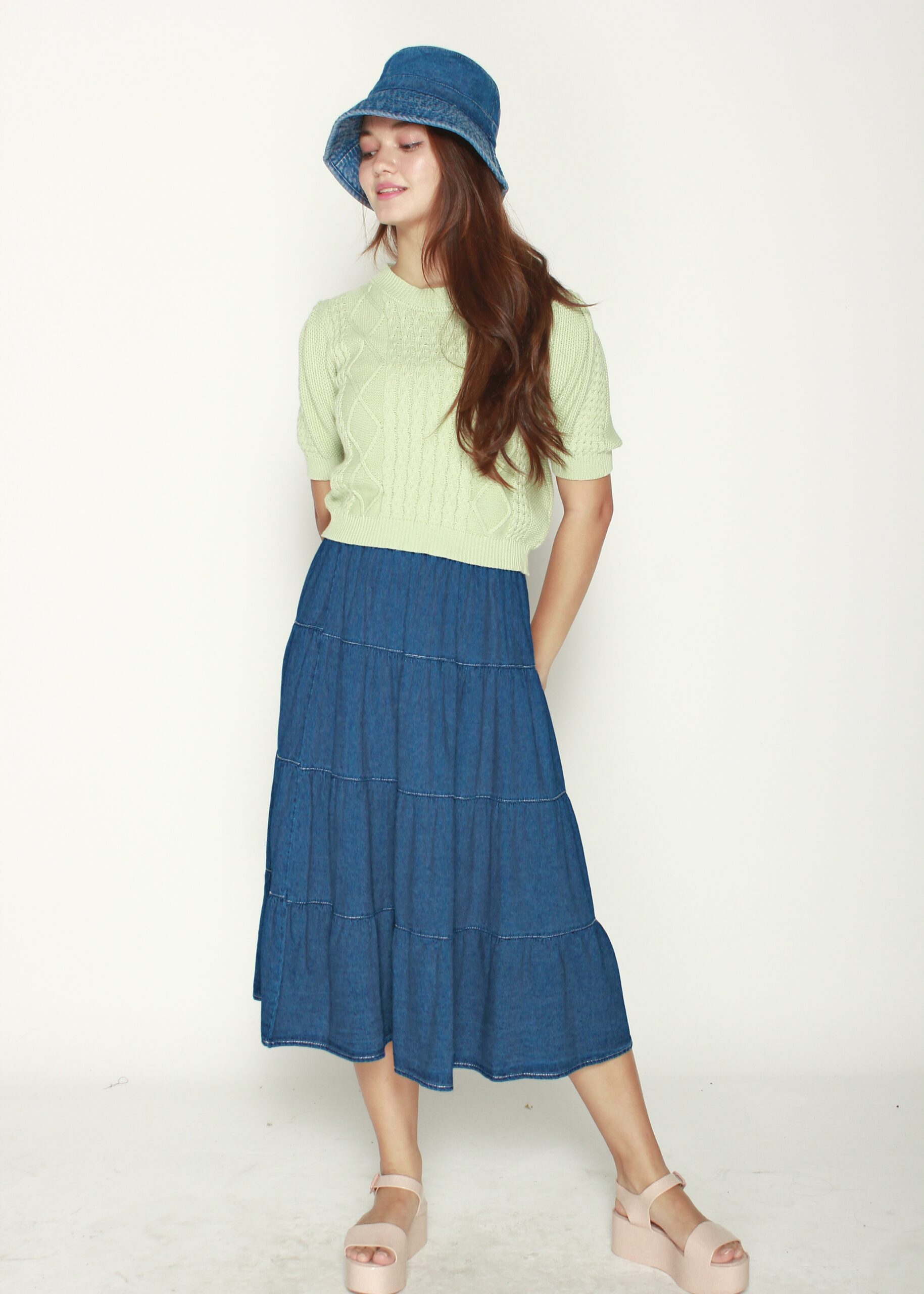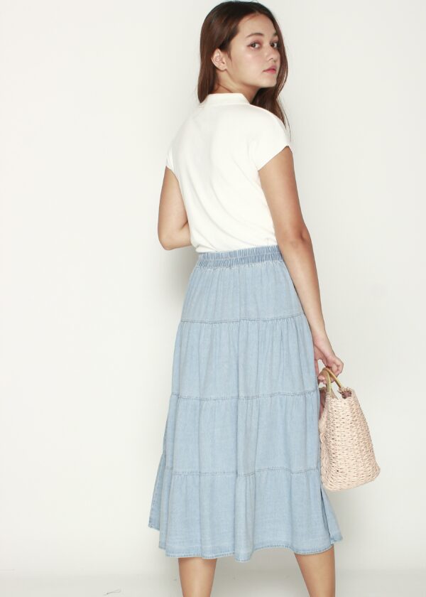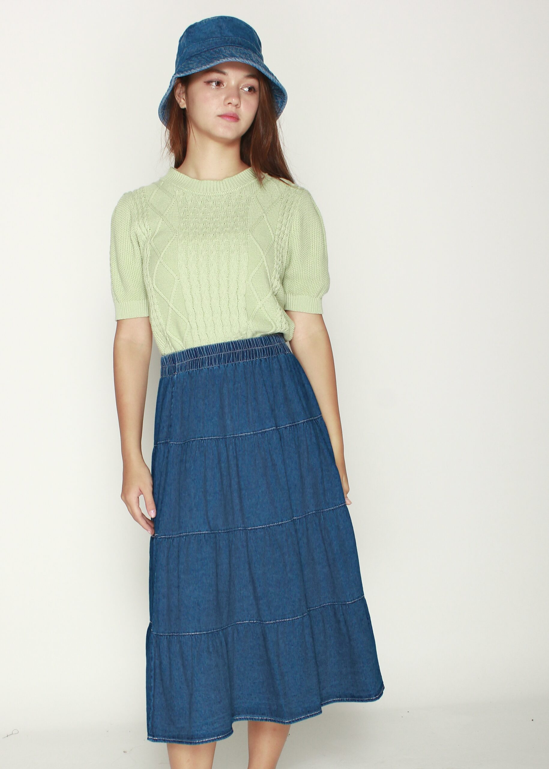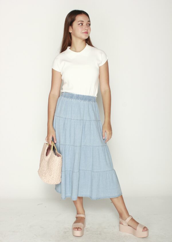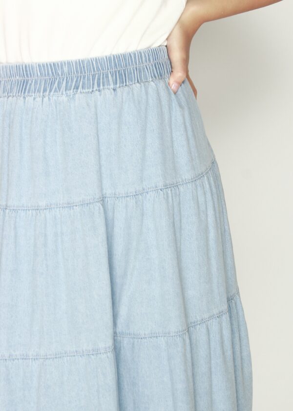 Flared denim midi skirt in stylish tiered design and elasticized waistline for comfortable fit